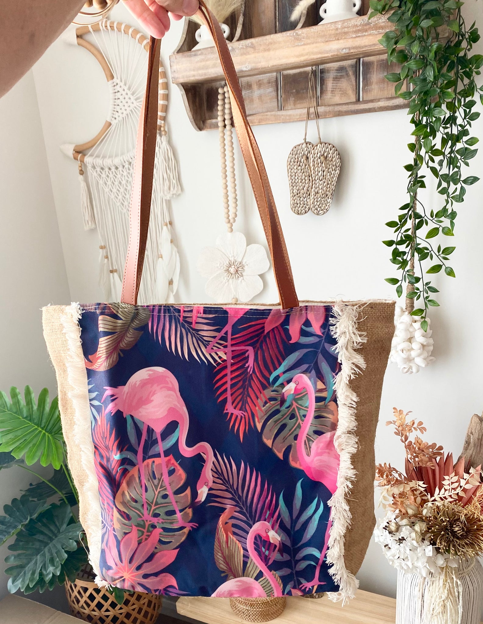 A must have bag for trips to the beach, the pool or shopping! Beautiful flamingo print.